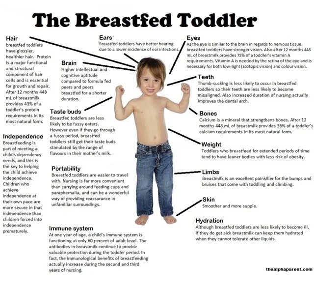"Breastfeeding toddlers between the ages of one and three have been found to have fewer illnesses, illnesses of shorter duration, and lower mortality rates.” (Mølbak 1994, van den Bogaard 1991, Gulick 1986).